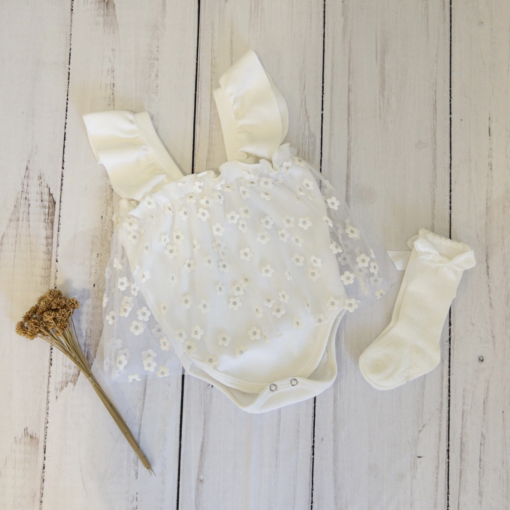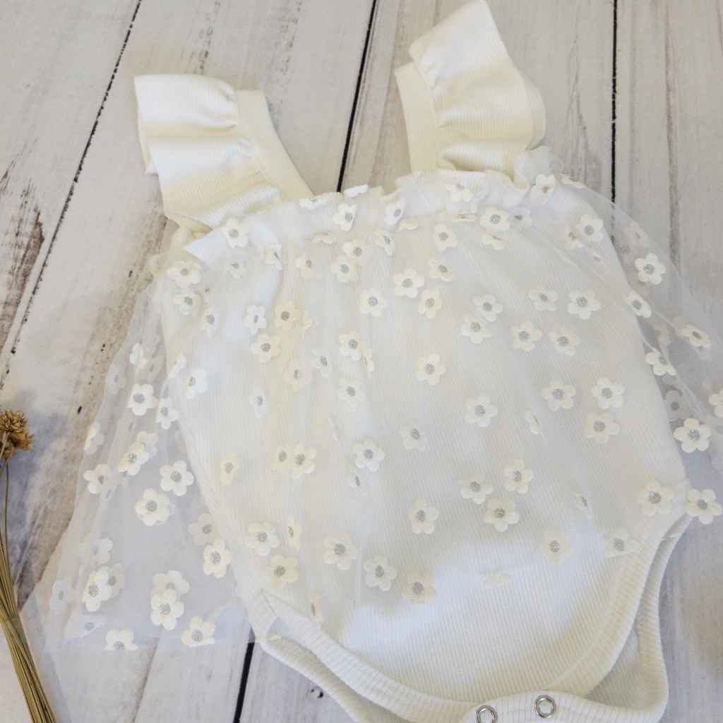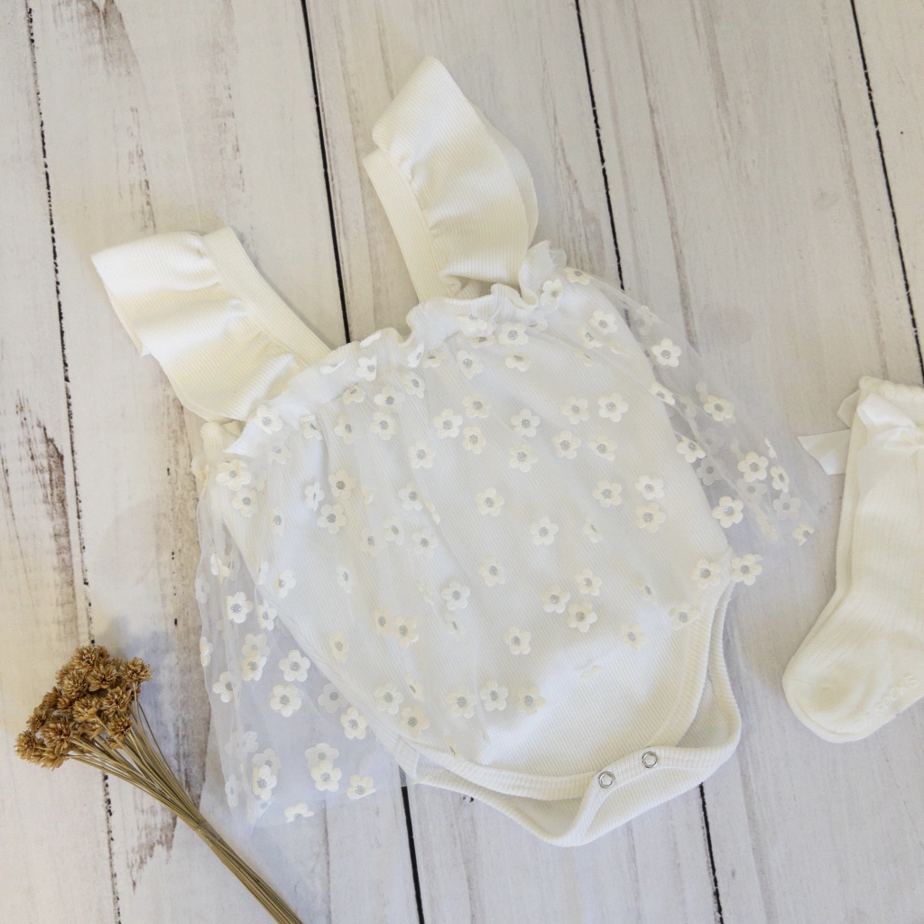 Design Floral Delicado: O tule com florzinhas é o destaque deste body vestido, trazendo um toque romântico e alegre que ilumina o olhar de todos ao redor.