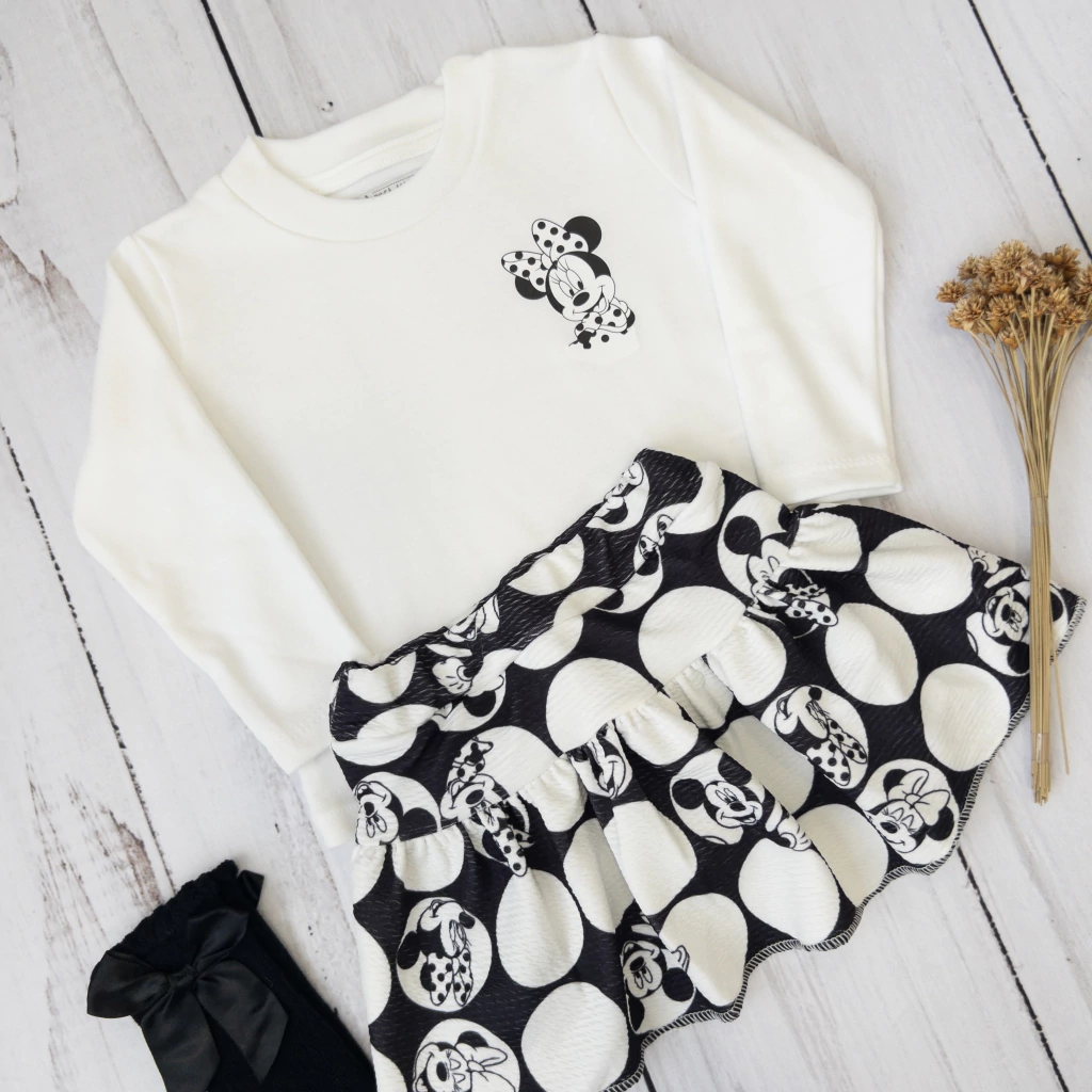 Estampa Minimalista da Minnie: Com um design que destaca a adorável Minnie Mouse, este conjunto proporciona um visual divertido e cheio de personalidade, ideal para as pequenas que amam a Disney.