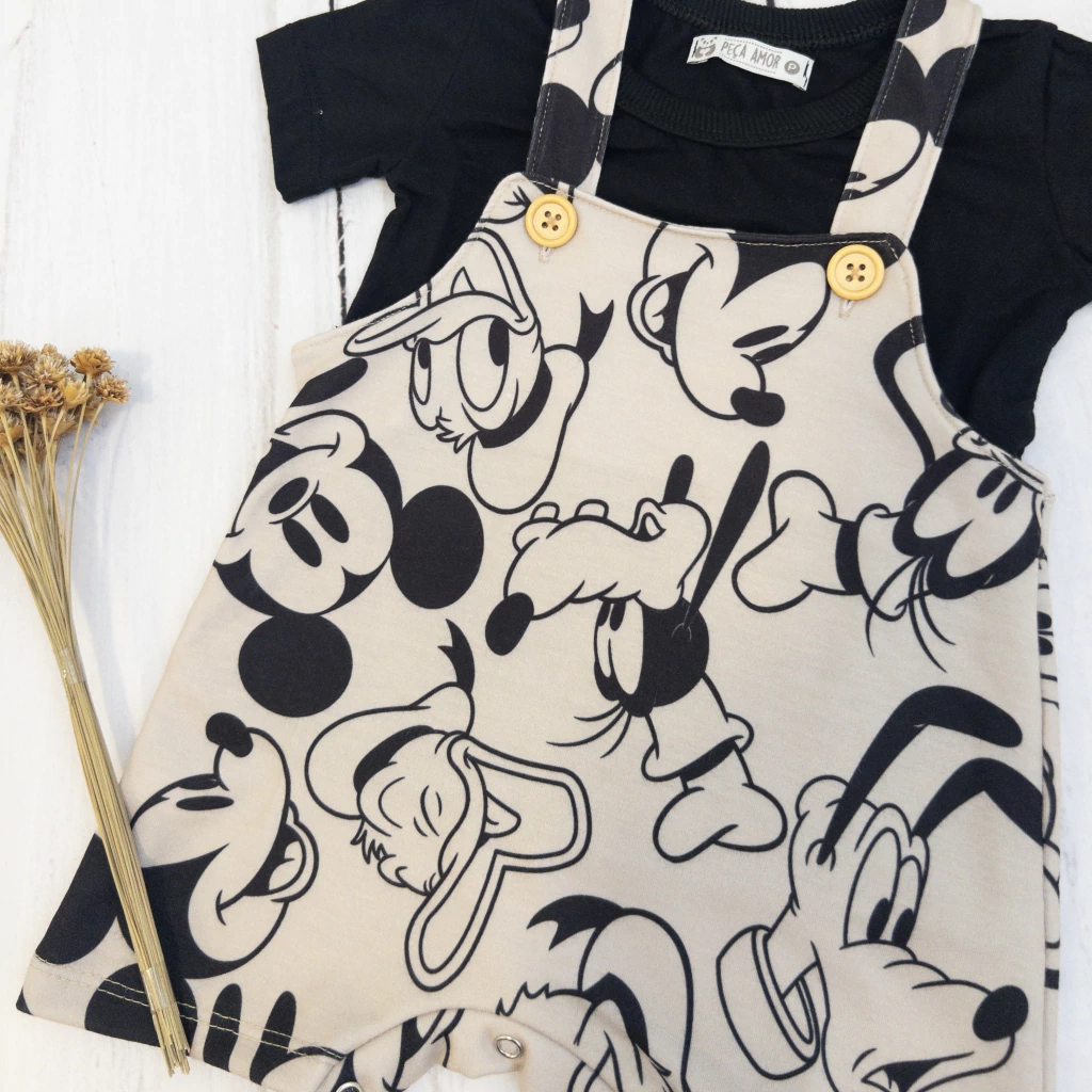 Deixe seu pequeno brilhar e se divertir com a Jardineira da Turma do Mickey e a blusa preta básica – conforto, estilo e magia Disney em cada detalhe!